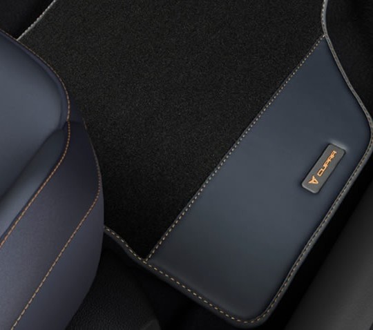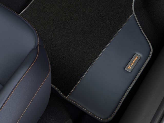 Hautement durables pour éviter l'usure;les tapis de sol CUPRA en similicuir bleu pétrole préservent l'aspect sophistiqué de l'habitacle. Personnalisés avec le logo CUPRA.