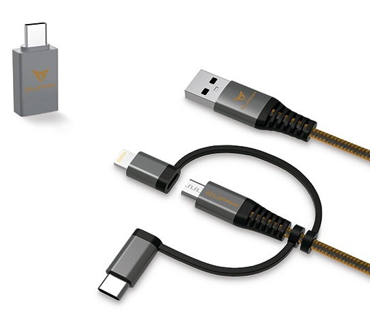 Solution de charge complète dans un packaging CUPRA - Câble MFI 3 en 1 : Câbles USB Type-C;Micro-USB et Lightning (Apple) Design 3 en 1 qui permet la recharge et le transfert de données simultanément. Taux de transfert de données jusqu'à 480 Mbps Sortie : 2,4 A. Longueur du câble : 1 mètre • Adaptateur USB vers Type-C avec corps en aluminium