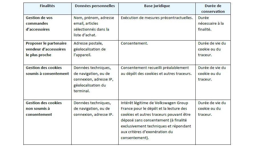 Chaque traitement réalisé par Volkswagen Group France répond à une finalité explicite, légitime et déterminée, qui se fonde sur l’exécution d’un contrat, votre consentement ou encore l’intérêt légitime de Volkswagen Group France.