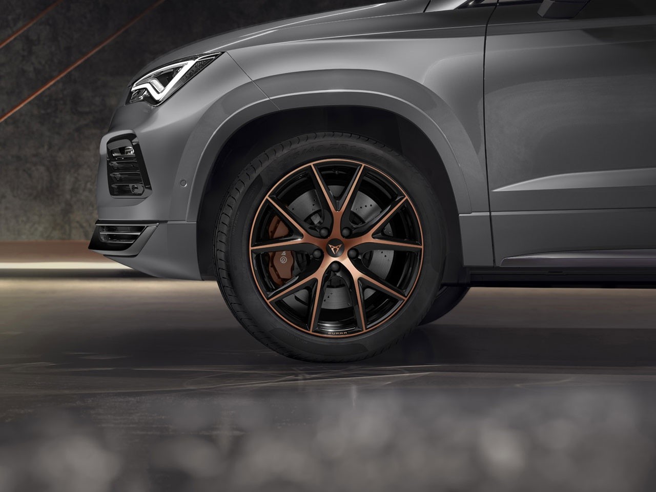 Conduisez en toute élégance avec ces jantes légères 19''’(48 cm) 5 branches en alliage noir et cuivre;tout en augmentant les performances de votre Ateca. Il est recommandé de faire installer les accessoires d’origine par un atelier CUPRA ou un partenaire de service. Le cache central et les vis des roues sont vendus séparément.